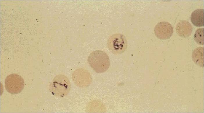 | Das vierte Bild aus Wikidoc zeigt zwischen den kernlosen Erythrozyten knapp über der Bildmitte und auf habem Wege zur linken unteren Ecke zwei Retikulozyten mit dunkel gefärbtem Chromatin. |