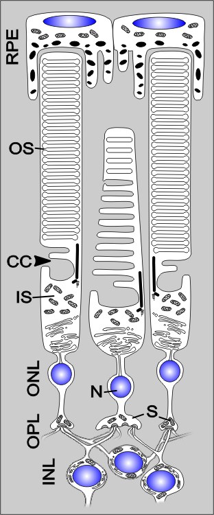 Dieses Schema zeigt zwei Stäbchen und einen Zapfen in der Retina. |