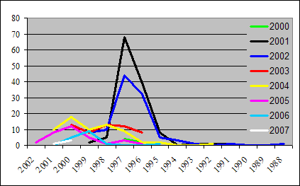 Die Kurven der Jahre 2001 und 2002 zeigen das deutliche Infektionsmaximum um den Beginn des Jahres 1996. Im Jahr 2003 fand man kaum noch BSE-Rinder, die zur Zeit dieses ersten uns bekannten Infektionsmaximums geboren wurden. Man erkennt im Jahr 2003 überhaupt kein Maximum. Im Jahr 2004 zeichnet sich jedoch ein neues Infektionsmaximum ab. Zumindest scheinen im Jahr 1999 mehr Kälber infiziert worden zu sein, als im Jahr 1998.